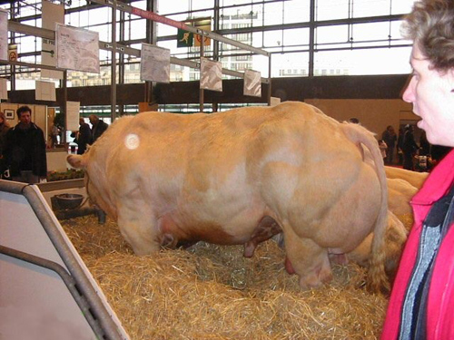 Awalnya pada abad 19 orang Belgia mengawinkan sapi ternak lokal dengan sapi Inggris, hasilnya adalah sapi Belgian Blue, si sapi raksasa ajaib. Ukurannya yang luar biasa dan otot-otot besarnya kadang-kadang dijuluki "double muscling", merupakan hasil suatu proses mutasi gen natural untuk myostatin, suatu protein bertanggung jawab dalam proses pertumbuhan otot. Mutasi ini menghasilkan percepatan pertumbuhan otot tanpa lemak.